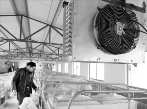 昨日,商水县农场老支村一养殖户在装有空调的猪舍内给生猪添加饲料。该村积极探索规模化经营、生态化饲养生猪的新路子,建设标准化猪舍,使生猪住上了“空调房”,饲养生猪的效益也得到明显提高。(刘飞 魏红 摄)
