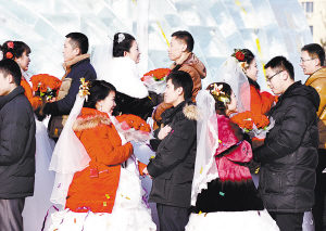 1月2日,新郎们在婚礼上向自己的新娘表白。当日,第30届哈尔滨国际冰雪集体婚礼在哈尔滨冰灯艺术游园会举行,19对新人参加婚礼盛典。