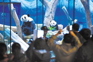 1月6日,观众在台北市动物园观看大熊猫“圆仔”(右)和妈妈“圆圆”。 当日,大陆赠台大熊猫“团团”和“圆圆”的首只宝宝“圆仔”正式和公众见面,大量台湾民众到场观看。2008年12月23日,大陆赠台熊猫“团团”“圆圆”抵台,并入住台北市动物园。“圆圆”于2013年7月6日顺利产下“圆仔”。