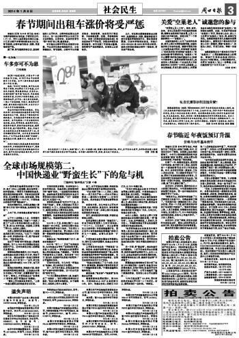 本报讯(记者 马四新 实习生 谢瑶)为维护乘客的合法权益,方便市民出行,1月1日,市中心城区综合治理办公室、川汇区出租汽车管理站联合发出公告,春节期间,出租车趁节涨价、拒载、甩客等将受严惩。