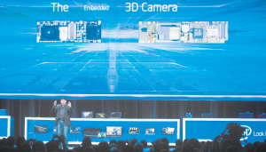1月6日,在美国拉斯韦加斯国际消费电子展上,英特尔公司高级副总裁兼感知计算业务总经理邓慕理展示3D摄像头新品。新华社记者 杨磊 摄