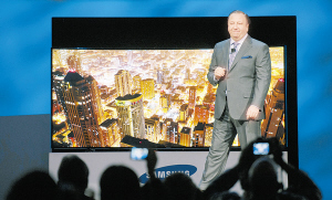 1月6日,在美国拉斯韦加斯国际消费电子展上,三星电子美国公司执行副总裁乔·斯汀茨亚诺介绍三星首款105英寸超高清OLED曲面电视。新华社记者 杨磊 摄