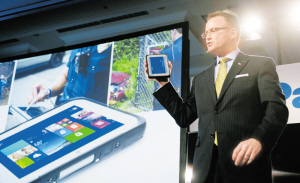 1月6日,在美国拉斯韦加斯,松下北美公司总裁兰斯·珀勒在新品发布会上展示基于Windows操作系统的掌上电脑ToughPad FZ-M1。新华社记者 杨磊 摄