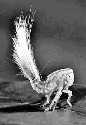 其实,那些“白毛”并非真正的毛发,而是蜡蝉分泌的蜡状细丝。那些细丝有什么好处呢?由于它们具有一定的黏性,令不少捕食者避而远之。另外,这种细丝还很容易断裂,即使被天敌抓住细丝,蜡蝉也很快就能挣脱这些细丝而逃生。毛茸蜡蝉还可以像孔雀开屏把尾部的细丝扩张开来,起到威吓天敌的作用。