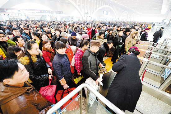1月13日,旅客在石家庄火车站排队等待检票进站。据铁路部门预计,2014年春运期间全国铁路将发送旅客25780万人次,同比增加1893万人次。(新华社发)