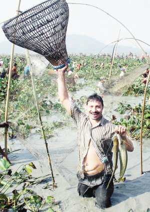 捕鱼庆丰收 1月13日,在印度东北部阿萨姆邦的高哈蒂,村民在湖水中参加集体捕鱼,庆祝丰收节。新华社发