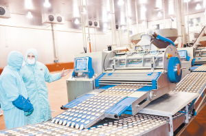 1月15日上午,在西华福喜麦当劳熟食加工基地,外国技术专家正在麦乐鸡块生产车间指导员工生产。(记者 张猛 通讯员 李永科 摄)