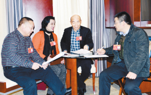 昨日上午,出席省十二届人大三次会议的我市代表在会议召开之前商议议案。(记者 王映 摄)