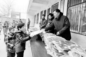 1月15日上午,周口市质量监督局一行人来到商水县谭庄镇焦城小学,为那里的孩子们送来4台电脑、300个书包以及桌椅板凳、乒乓球台、篮球架等教学体育设施,在新年来临之际让孩子们感受到了社会大家庭的温暖。(记者 王亚辉 摄)