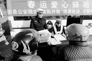 1月14日,在209国道广西融安县浮石镇路段,两名公安民警为骑摩托车的返乡人员讲解安全知识。 当日,广西柳州市融安县公安局首个春运爱心驿站正式启用。新华社发