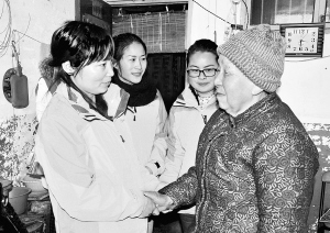 周口龙泰体育有限公司负责人李春玉带领员工看望独居老人吴秀云,陪老人唠嗑。记者 沈湛 摄