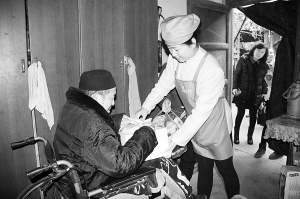 名代蛋糕公司员工为老人送去了蛋糕等礼品。记者 王亚辉 摄