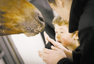 1月15日,在加拿大城市温哥华,一名盲童试图触摸马戏团的马匹。