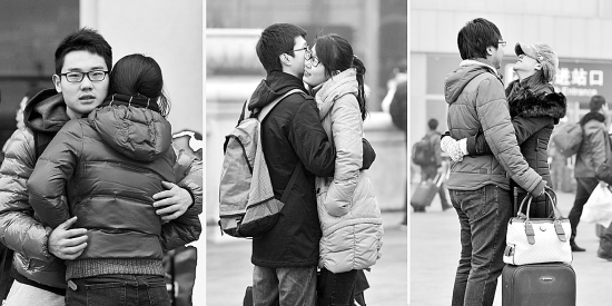 这是三对情侣在天津火车站依偎在一起的拼版照片(1月16日摄)。当日,2014年春运开始,记者来到火车站,用镜头记录下春运大潮中的旅客百态。新华社记者岳月伟摄
