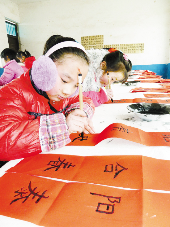 1月21日,素有“中国书法之乡”之称的郸城县,组织全县书法爱好者积极开展“手写春联免费送”迎新年活动。图为该县南丰镇刘胡小学组织学生开展的写春联活动。 (记者 徐松 摄)