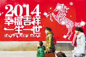 1月25日,在郑州市街头,几位市民从一幅新春招贴画前经过(上图)。马年春节临近,郑州市的各个公园和广场,营造了红红火火的新春氛围。(新华社发)