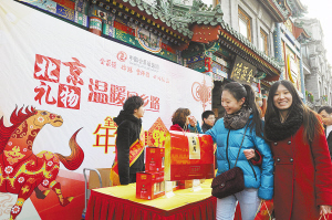喜庆年货温暖回乡路 1月26日,顾客在北京前门大街全聚德烤鸭店年货售卖点选购年货。当日,“北京礼物”温暖回乡路——年货送福活动在北京举行。北京全聚德、丰泽园等中华老字号餐饮企业,在线上线下500余个年货销售终端,开卖烤鸭、年糕等8大类传统特色年货,为即将到来的马年春节增添喜庆祥和之气。