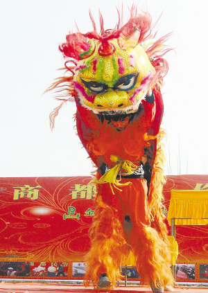 郑州庙会展示年俗文化 1月26日,狮舞演员为游客表演高难度动作。当日,2014郑州商都民俗庙会在郑州金鹭鸵鸟园景区开幕。