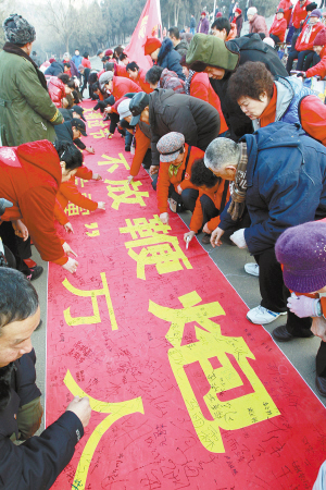 山东济南万人签名倡导文明过节 1月25日,在山东济南战役纪念馆门前广场,市民在倡导文明过节的横幅上签名。