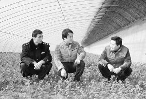 近年来,扶沟县崔桥镇积极发挥人大代表作用,把家庭农场作为推动现代农业发展的重要载体,着力引导符合条件的农村市场经营主体向家庭农场转变。图为该镇人大组织有关部门工作人员在一家庭农场查看蔬菜生长情况。