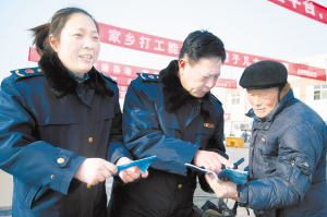 1月25日,扶沟举办“春风行动”大型返乡农民工招聘会,吸引返乡农民工在家门口创业就业。图为工作人员向参加招聘会的农民工发放维权手册。(卢付昌 摄)