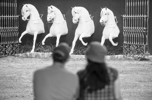 图④ 这张2013年2月7日的资料照片显示,在秘鲁首都利马,一对情侣欣赏马形雕塑。