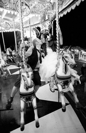 图② 这张2010年8月5日的资料照片显示,在英国赫里福郡举行的大寒音乐节上,新婚的菲尔波特夫妇坐在旋转木马上亲吻。