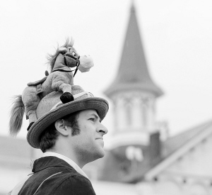 图③ 这张2013年5月4日的资料照片显示,在美国肯塔基州路易斯维尔,里克·斯图尔特头戴有着马形玩具装饰的帽子准备参加第139届“肯塔基德比”赛马节。