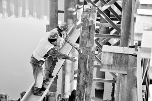 昨日,两名工人在东环城路跨沙河大桥施工现场检查工程质量。为了确保大桥如期交付使用,施工方组织人员顶着寒风加班加点工作在一线。(记者 沈湛 摄)