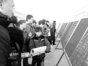 2月11日是市文昌中学高一学生开学第一天。文昌中学以别开生面的形式迎接500多名学生返校。当天上午9点到10点,学校班子成员和高一班班主任以及学校老师列队在校门口,欢迎学子返校。图为学生在察看分班情况。