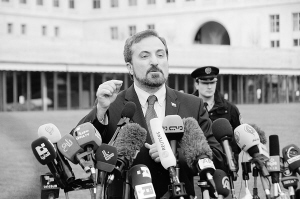 图① 2月15日,在瑞士日内瓦万国宫,叙利亚境外主要反对派“叙利亚反对派和革命力量全国联盟”(“全国联盟”)发言人卢瓦伊·萨菲接受记者采访。
