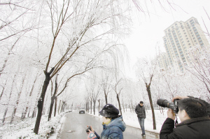 2月18日上午,我市摄影爱好者在拍雪景。降雪后的中心城区银装素裹,吸引了众多市民外出赏雪。不过,由于气温升高,这样的美景却是昙花一现,中午时分便已消失。 (记者 金月全 摄)