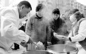 图③:周国平在诊所门口为贫困病人和家属盛饭,“国平义务诊所”每天为贫困病人提供免费午餐。
