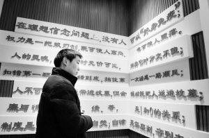 2月18日,一名共产党党员在“德园”反腐警示基地观看警示语录。江苏省淮安市探索“实境课堂”的教学方式,将现场变为课堂、素材变成教材、讲解变成教学。自2014年2月起,淮安2万多名科级以上党员干部将带头到周恩来纪念馆、苏皖边区政府旧址、新四军刘老庄纪念园、“德园”反腐警示点等6个“实境课堂”接受教育,在“情境再现”“问题导引”“现场互动”等教学环节中,扎扎实实进行自我反思、自我批评和自我提升。 新华社记者 李响 摄