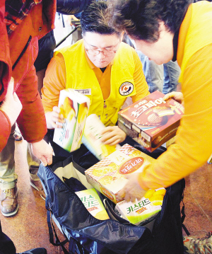 韩国离散家属在束草集合 2月19日,工作人员在韩国江原道束草打包离散家属带给在朝鲜亲人的礼物。