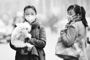 2月25日,一个女孩给小狗戴上口罩走在雾霾笼罩的石家庄街头。当日,中央气象台继续发布霾橙色预警:预计25日8时至26日8时,北京、天津、河北、山西东部和南部、河南北部、辽宁中部等地气象条件很不利于空气中污染物扩散,将有中度霾,其中北京、天津、河北中南部、河南北部等地有重度霾。新华社发