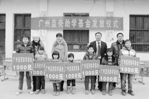 本报讯 (记者 杜少华 通讯员 王未昌 李晓伟 文/图)2月25日上午,广州蓝壳润滑油有限公司资助鹿邑县7名贫困学子基金发放仪式在该县玄武镇实验学校举行。此次资助对象为5名小学生和2名初中生,每人每年接受资助款1000元。