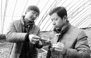 近日,扶沟县组织科技人员针对目前的天气状况走村入户指导菜农蔬菜苗期管理技术。图为县蔬菜技术中心的技术人员在调查黄瓜苗期生长状况,指导菜农科学管理。(谷志方 摄)