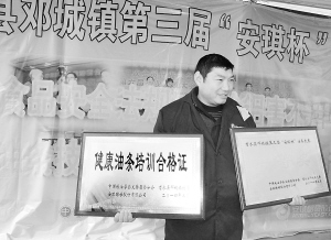 2月13日,邓城镇范庄行政村村民曹红全荣获该镇第三届油条大赛冠军,。近年来,邓城镇充分发挥油条加工的优势,加大技术培训力度,举办油条培训班12次,受益群众达1.2万人。目前,该镇每年外出从事炸油条行业的务工人员达5000人,直接经济效益达3000多万元。 记者 岳建辉 通讯员 王新建 摄