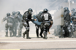 2月26日,在巴西里约热内卢,防暴警察在演习中控制了一名带头闹事的“抗议者”。当日,巴西里约州防暴警察在其总部举行了一场处置应对暴力示威活动的演习。据介绍,此次演习是里约防暴警察为应对即将到来的狂欢节和世界杯期间可能出现的类似情况而进行的针对性训练。新华社记者 徐子鉴 摄