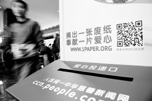 2014年全国两会期间全国政协委员驻地——北京铁道大厦的废报纸回收箱(3月2日摄)。2014年全国两会期间,由中华慈善总会发起的“一张纸献爱心”慈善工程的“爱心屋”进入全国政协委员驻地,用于收集阅读后的旧报纸等,变卖所得资金及募捐善款将用于资助贫困家庭的先天性心脏病儿童。新华社记者 刘金海 摄