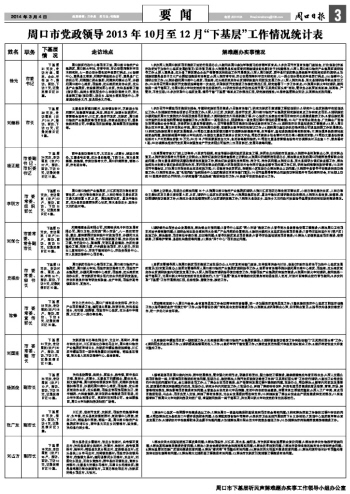 周口市党政领导2013年10月至12月“下基层”工作情况统计表