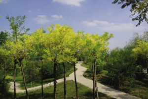 沈丘县本没有山、没有湖,建设者们利用废旧坑塘开挖修葺了一个人工湖,挖出的泥土就地堆成一个小岛和一座土山。这样,槐园地形起伏跌宕,绿色、美化有了立体感和层次感。有人由衷地感叹:槐园是有山有水有灵气。湖水清澈见底,登上槐香山,站在观槐亭极目远眺,整个槐园尽收眼底,花木葱茏,山水倒映,美不胜收。