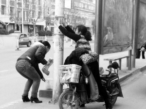 昨日下午,在市区八一路南段路东,几位女子沿路依次在路灯杆上贴着某商家电器的促销广告,花花绿绿的小广告影响着市容市貌。(记者 王映 摄)