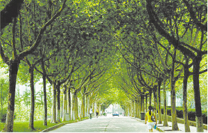 法桐,悬铃木科,落叶乔木,耐修剪,耐寒,耐旱,成型快,病虫害少,遮荫效果好,大树移植成活率高。对城市环境适应性强,叶片具有超强的吸收有害气体、抵抗烟尘、隔离噪音能力,广泛应用于城市绿化,列植于街道两旁颇为合适,是世界著名的优良庭荫树和行道树,被称为“行道树之王”。在周口以法桐为行道树的道路,都形成了绿色长廊景观。法桐落果时产生的飞絮对皮肤过敏者稍有危害。法桐曾是市区主要街道的绿化品种,很受市民喜爱。