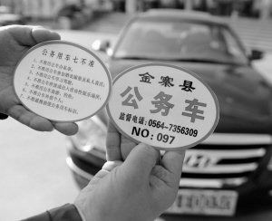 3月17日,金寨县的一名工作人员在展示公务用车贴标。 自今年3月12日起,安徽省金寨县对全县200多辆一般公务用车进行统一贴标,贴标印有“公务车”字样、车贴编码、监督电话及“公务用车七不准”细则,以亮明公车身份,接受社会监督。