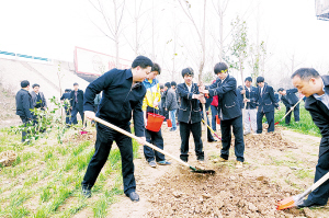 黄真伟等领导有的挥锹给树坑填土(如图),有的用力将填好的土培实,有的俯身为新种下的树浇水……每一道工序,大家都做得一丝不苟。刚种下的小树苗沐浴在和煦的春风里,展现出勃勃生机。