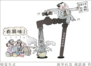 事实上,我国从2012年7月起开始执行的生活饮用水卫生标准,检测指标达106项,与世界最严的欧盟水质标准基本持平,标准中规定“生活饮用水的感官性状要良好”,在“臭和味”一项中更明确要求“无异臭、异味”。作为强制性标准,这意味着106项指标中任意一项不合格都代表水质有问题,当然也包括“异味”在内。而被普遍反映有异味的“问题水”被检测为“合格”,这究竟是由于公众的嗅觉“集体失灵”,还是相关机构“选择性失明”,答案不言自明。 新华社发