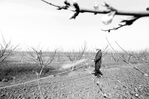 昨日,商水县汤庄乡硕博果业生态园里的工人正在给桃树喷施沼液。该县通过发展高效经济作物和生态良性循环农业,着力打造2万亩城郊型现代农业示范园,现已入驻涉农企业15家,是一个集蔬菜、水果、苗木种植、畜牧养殖和休闲观光为一体的现代农业示范园区。(魏红 刘飞摄)