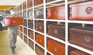 3月27日,在位于韩国京畿道坡州市的中国人民志愿军遗骸临时安置所,韩国士兵将装着遗骸的棺椁起运装车。 当日,韩国军人将存放在坡州市的437具中国人民志愿军烈士遗骸的棺木起运至仁川国际机场。中韩将于韩国当地时间3月28日早7时在韩国仁川国际机场进行中国人民志愿军烈士遗骸交接仪式。